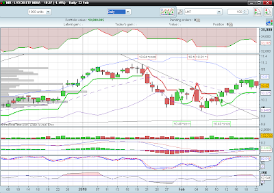 As I've said in the last update (http://mytrendfollower.blogspot.com/2010/02/silver_23.html), the SLV was developing a nice support price in the 15.49 level. This was written by Tuesday's close and, as you can check in this chart, in wednesday that level hold any attempt to drop down the SLV. By Wednesday's close I was relying pretty much on the 15.49 level in order to sell the SLV if the price went down that level.